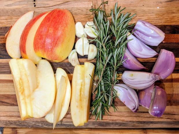We’ve brined the loin, then cut the loin in half, seasoned with a sea salt/black pepper/brown sugar/garam masala rub, and stuffed with apples, shallots, garlic, rosemary. The two loin sections are tied with cotton twine, rubbed with olive oil and pierced with cloves, and roasted at 325F for 20 minutes per pound.