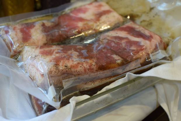 Mix thoroughly and add to your pork belly in the bag. Distribute evenly and either vacuum seal on the gentle/moist setting, or try to get as much air out of your gallon zip loc bag as possible.