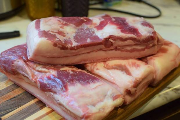After thawing the pork bellies for several days, I removed the skin carefully and with a very sharp knife.
