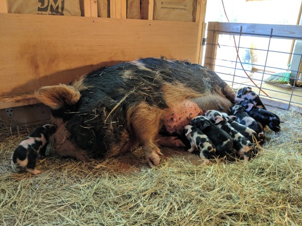 I can’t put a time estimate on the amount of labor put towards maintaining fencing and structures, driving to purchase feed and hay, growing produce and other food for the pigs, driving to pick up loads of apples or pumpkins. We bring piglets into the world, sleeping in the barn for the first few nights of their lives, to make sure they all survive those first critical days. We see the pigs every single day, multiple times a day until it is their time to bless us with their sacrifice, and provide good, clean, properly raised pork for our community.